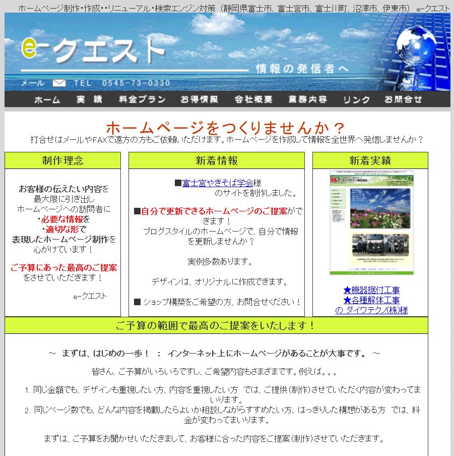 e-クエストは静岡県富士市に拠点を置き、ホームページ制作事業の他にアンケート調査代行サービスやパソコン導入サポートなどを提供しています。