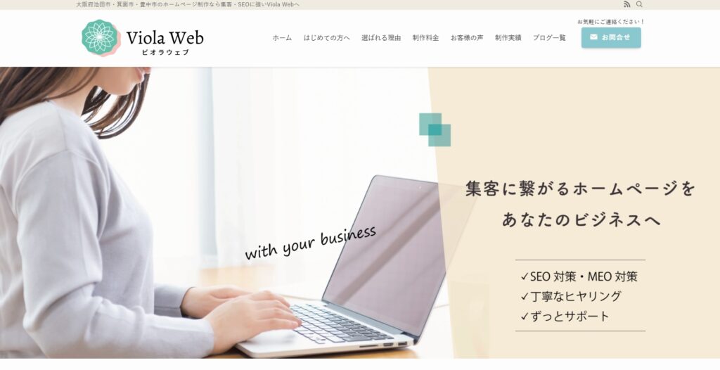 Viola Web(ビオラウェブ)は、大阪府池田市にある結果にこだわる「集客型ホームページ」を提供する制作会社です。ホームページを持つこと自体ではなく、「売上げを運んできてくれるホームページ」を作り、「売れる仕組み」を作るところをゴールとしています。