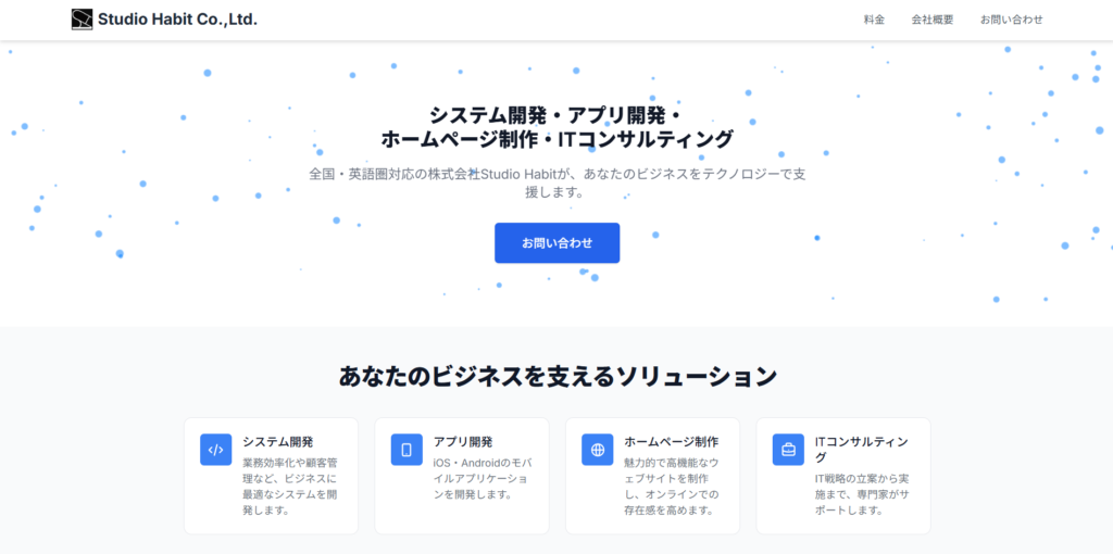 株式会社Studio Habitは、大阪府守口市に拠点を置き、ホームページ制作、システム開発、アプリ開発、ITコンサルティングなど、幅広い事業を展開している制作会社です。クライアントの“ひらめきをカタチ”にし、社会や暮らしに貢献することを目指しています。