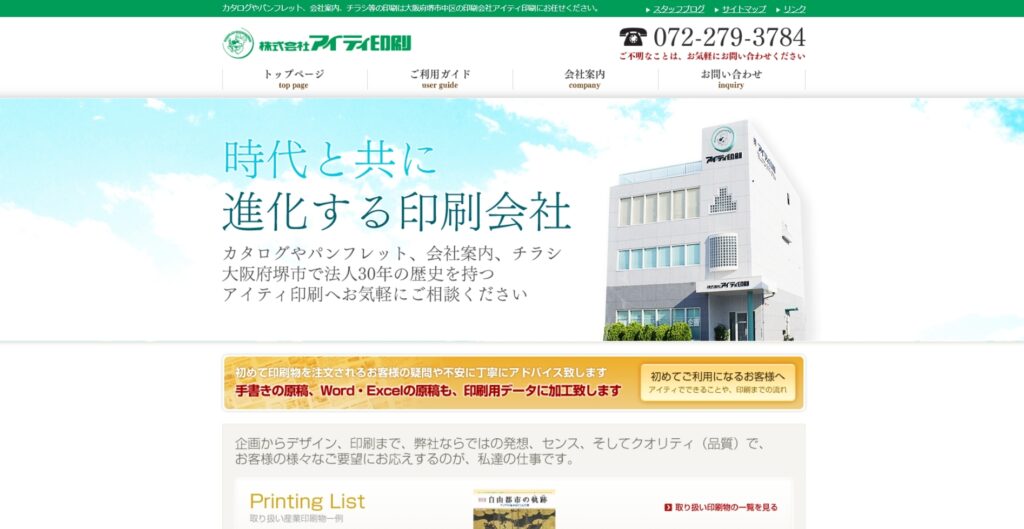 株式会社アイティ印刷は、大阪府堺市にて商業印刷事業を軸に、カタログ、パンフレット、会社案内、チラシ等による企業の販促をお手伝いしている会社です。長年の印刷事業で培った販促のノウハウを活かし、ホームページ制作やモバイルサイト制作、SEO対策といったWebサービスを提供しています。
