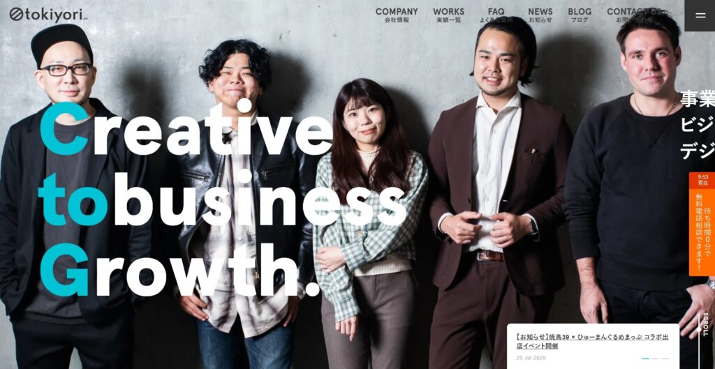 トキヨリ株式会社は、福岡県北九州市を拠点に、「事業成長をアシストする、ビジネスのバリューをデジタルクリエイティブで創る」ことを目指す制作会社です。マーケティング・ブランディングのトレンドを取り入れつつ、運用性や保守性に優れたサイトを提供しています。