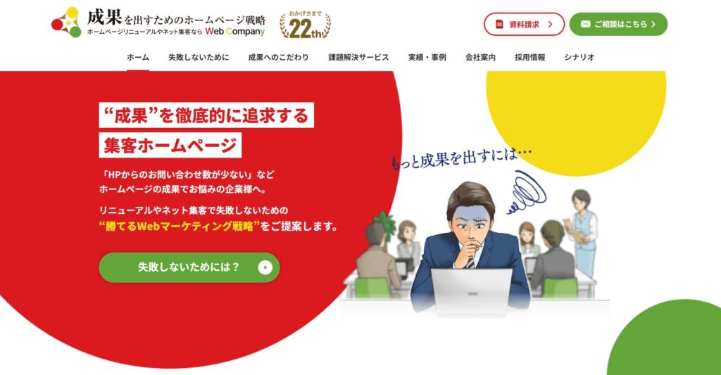 「ホームページを制作するだけの業者」ではなく、ホームページを利益を生むためのビジネスツールとして活用できるようにすることを目標としています。そのため、売上げが増えるまで責任を持つという強い決意のもと、【成果報酬型】の集客ホームページリニューアルやWebコンサルティングなどのサービスを提供しています。