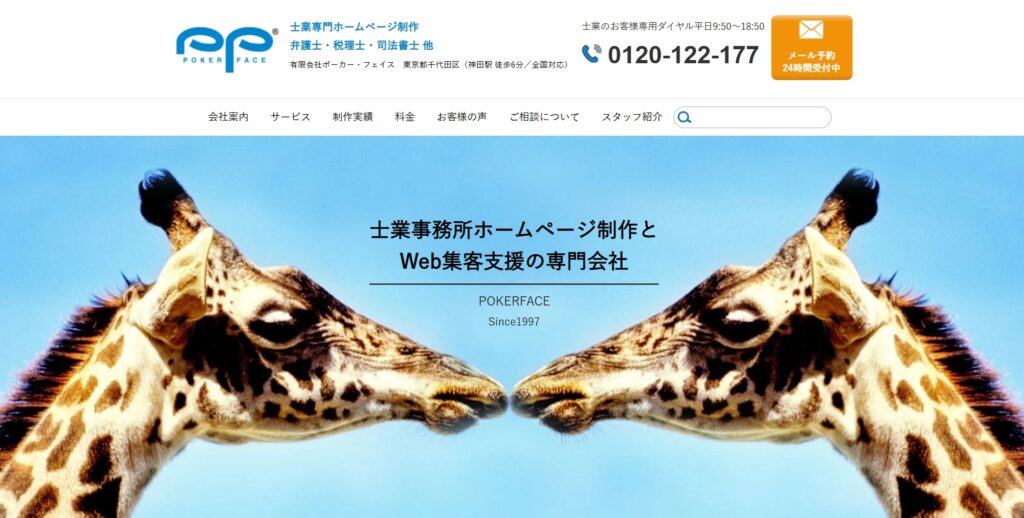 有限会社ポーカー・フェイスは、士業事務所のWeb集客において、四半世紀にわたる実績を持つプロフェッショナル企業です。「ホームページは作って終わりではない」という理念のもと、制作から保守管理、リスティング広告、さらには名刺やパンフレット等の印刷物までを窓口ひとつでトータルサポートしています。