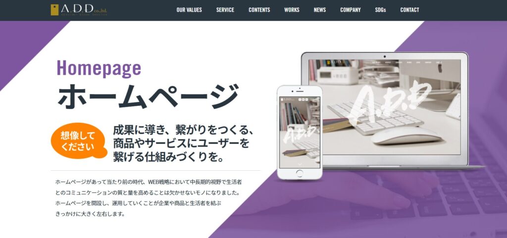 株式会社A.D.Dの特長は、「設計・戦略」と「デザイン」の両輪から、企業や商品の強みとユーザーをマッチングさせたブランディングをおこなう点にあります。Webサイト制作は完全オーダーメイドで行われ、PC、タブレット、スマートフォンそれぞれに対応したレスポンシブなデザインが可能です。