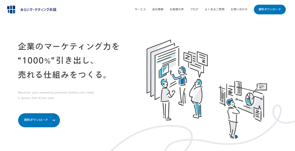 株式会社みらいマーケティング本舗は、Webサイトを「売上拡大と事業成長の起点」と位置づけ、集客特化型のWebサイト制作と、包括的なデジタルマーケティング支援を提供している会社です。