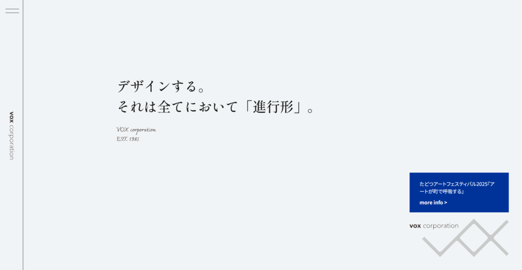 有限会社ヴォックスは、香川県観音寺市を拠点に、デザインの力でビジネスを「進行形」へと導くクリエイティブ会社です。その業務範囲はWeb制作にとどまらず、グラフィックデザイン、パッケージデザイン、そして広告代理業務まで多岐にわたり、クライアントのあらゆる表現活動をサポートしています。